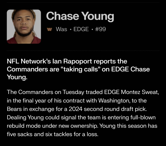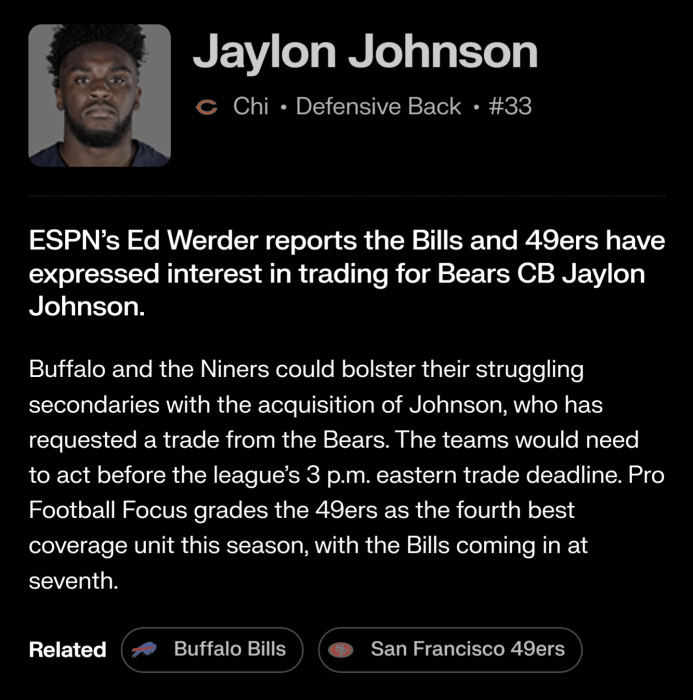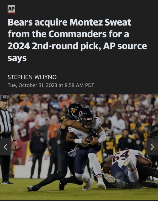He would def help us, too bad hes prob a rental and prob will go to Bills. 69ers are out of cap next year. Only thing is if Bears eat the money in this trade, which they can do. Wish we did something this deadline at least. Steelers might be able to grab him.Please Bills or another team, step in and don't let the bitch ass Whiners get him.