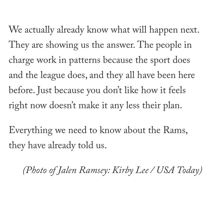 I'm certainly seeing it differently. The Rams appear to be about 2024, and this year we only have a 2'nd and two 3'rd round draft picks, after that it's likely to be only 5'th, 6'th and 7'th round developmental players. I can easily see the Rams spending their first 3 picks on an Edge, a back-up QB, and a TE, after that, who knows, although I think we can all agree that we'll need a kicker somewhere along the line. With this OL, keeping Stafford upright might seem very important, but with him out, where do we go from there. Unless free agency brings in a couple of surprises we're in trouble, and how many of you are really expecting that ?