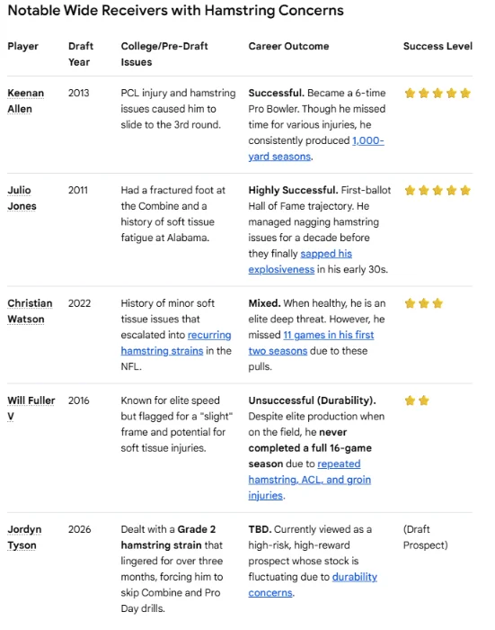 These injury concerns seem to be valid. I pulled the info below from AI, listing past notable draft prospects with hamstring issues prior to being drafted. Some went on to be real successful and some not so well. I really want Tyson for the Rams, but this info definitely raises concerns.