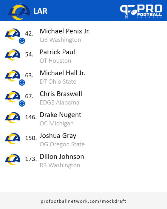 Just don't take him too early. Kid's very brave in the pocket. He's gonna be a pocket passer in the NFL. But I wouldn't touch him until round 2 range at the least due to his injuries. I think in that range though his skills and ability to hit deep passes endears him greatly to McVay. Question is does McVay jive with him in the whiteboard session.There's a lot of reasons to like Penix but there's a lot of reasons to pump the breaks. This is a good one. Along with his injury history, age, etc... I think unless you're a team that needs to take him, I'd steer clear. Need and eye candy will almost ensure he goes in the 1st but if he were to drop to the 2nd I don't think you take him unless you need a QB and your already on the "let's take a chance" carousel.