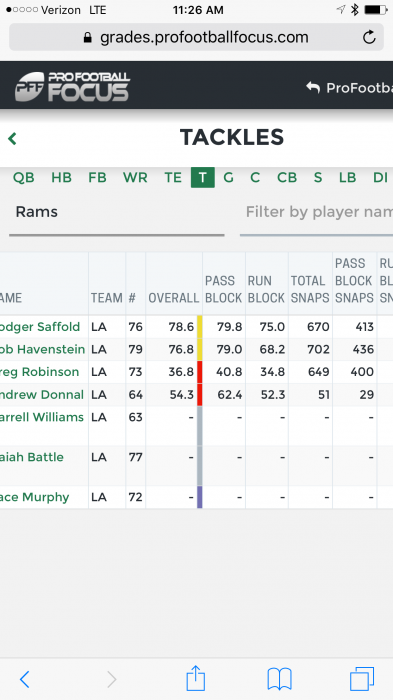 For those of you who discount PFF, do you disagree with Aaron Donald as the top performer in the NFL? Did ANY of you break down EVERY PLAY? Donnal was better than GRob but that doesn't take much. I understand why Fisher is pretending this was a "one week break." Maybe Robinson rededicates, maybe he just doesn't have IT. My vote is that he is a Jason Smith clone....all the ability...not mentally cut out for the job. High draft picks are hard to jettison but after a few years, you have to make that hard decision.