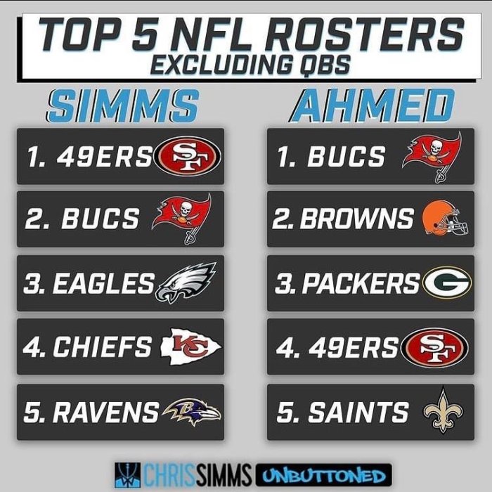 Pretty laughable to have two separate top 5 roster lists, and both the Rams and the Bills are absent from both of them.