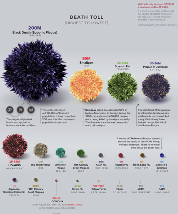 Thankfully this is not the worst pandemic the world has seen... very far from it. Below is a good graphic to show the relative sizes of pandemics throughout history. And yes, the Black Plague was a doozy.
