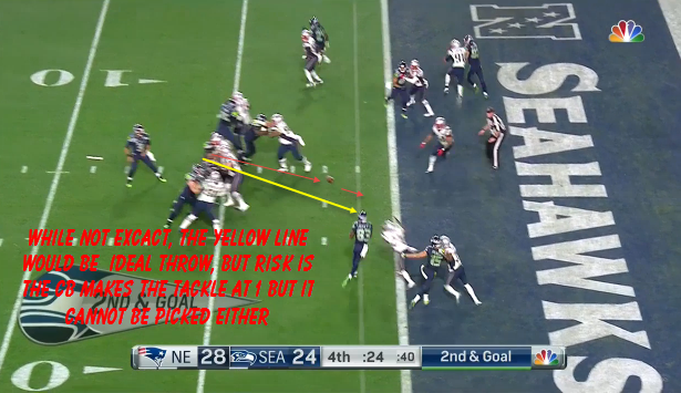 It still doesn't negate the fact that, due to the time on the clock, that was not the time to run it.There are safer ways to get cute. Empty backfield is not one of them. Fake the power run up the gut and let the TE slide free, or run the QB around the end. They have the QB for it and he is quite elusive. I think the Seahawks really had better plays to choose from even if they did want to try to pass it. How about a designed pick. They ran one earlier and it worked great. Ran Revis right into the ref.