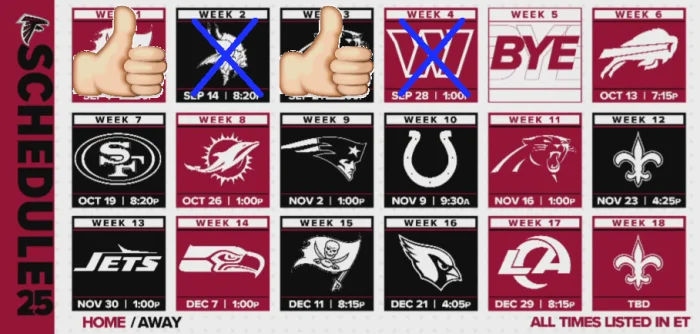 Looks like 11-6. I think they are better than this first quarter of the season.There's still time for Atlanta to disintegrate. After their bye they have the Bills, hopefully they lose that one which would put them at 2-3. From there I would hope the NFC West games, the Bucs, the Colts, and then maybe one or two of the lesser matchups they have ahead can produce 6-8 more losses.