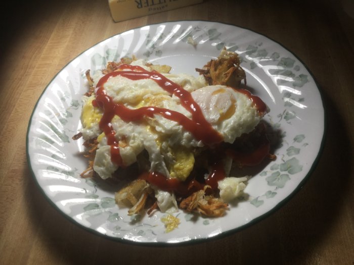 You are missing out. It is truly excellent, and you must try it right now....Now shred a potato and make hash browns, fry up three eggs and mix it all together with a tasteful amount of ketchup and tobasco. Salt and pepper to taste.