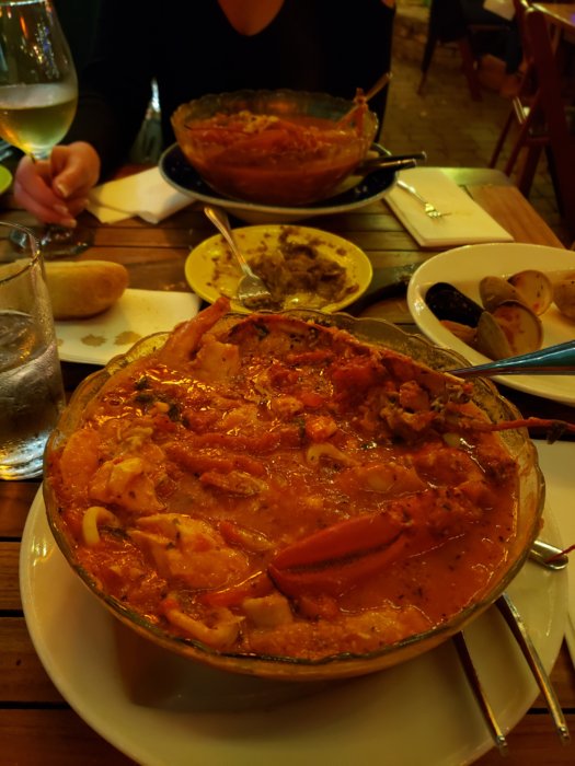 Cioppino?Had to bring most of this home for later. Got some fresh bread to go too. Midnight snacking will be happening later tonight.