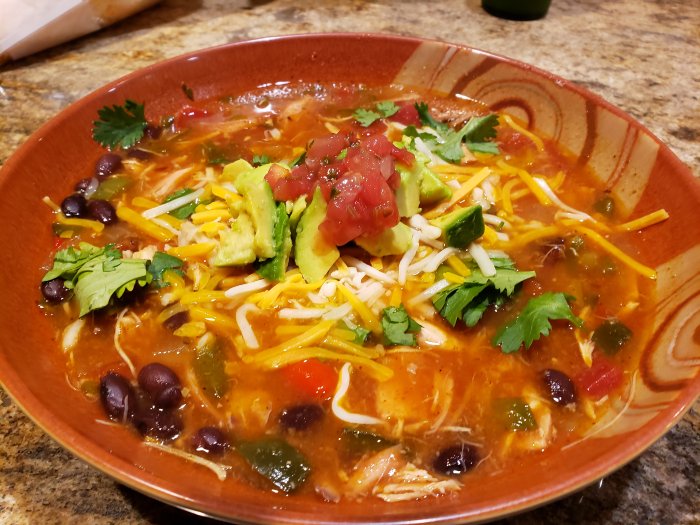 Here's a shot of my 1st bowl. I don't add the corn tortillas on top of mine like my wife does. I just add on some cheese, fresh avocado, cilantro, and pico de gallo. You can also add sour cream on top. I already have lots of spicy peppers in the soup, so no extra is really needed.