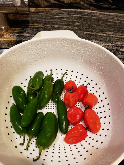 The one on the left has jalapeno, ghost, arbol, and habanero peppers. Heat level is supposed to be 110K on the Scoville heat scale.