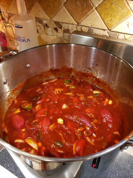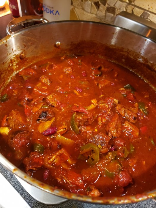 This is a shot of my giant pot of chili after everything was finally added including the beans. I don't add a lot of beans because too many can be too much. My chili has to cook for at least 6 hours... so here's a good bean tip... don't add the beans until the last hour or so because they will overcook if you add them too early.