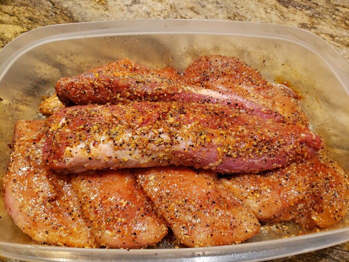 Here's a shot of the breasts and tenderloins precooked... I spice everything up before I get started with the chili, so that means this stuff has been sitting for several hours first.