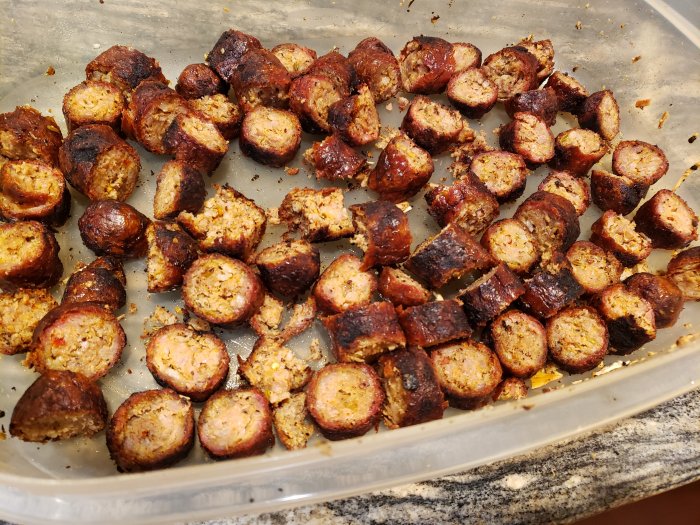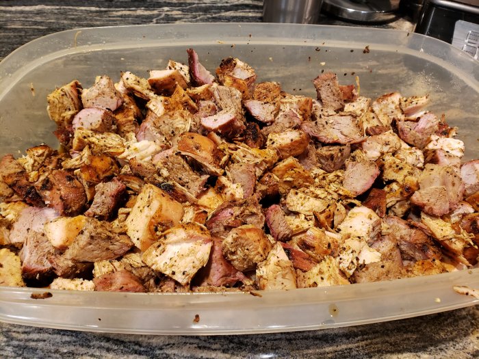 I grill all the meat first. I use large chicken breasts, pork tenderloins, and spicy Italian sausage.