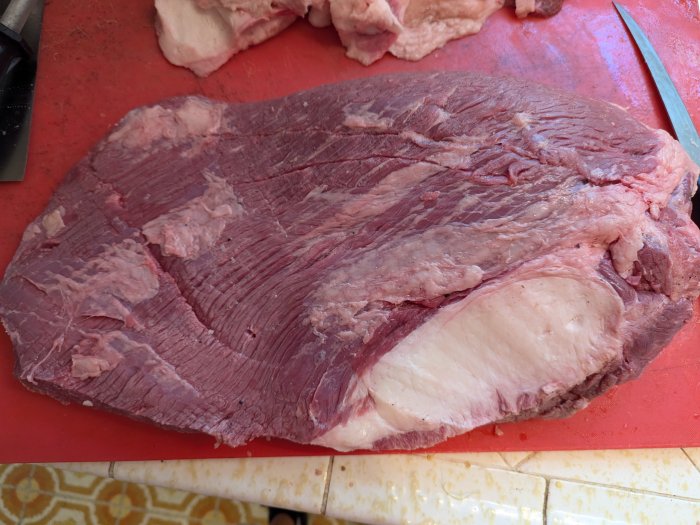 Roughly 15lbs before trimming and smoking. Ending weight was about 7 lbs.