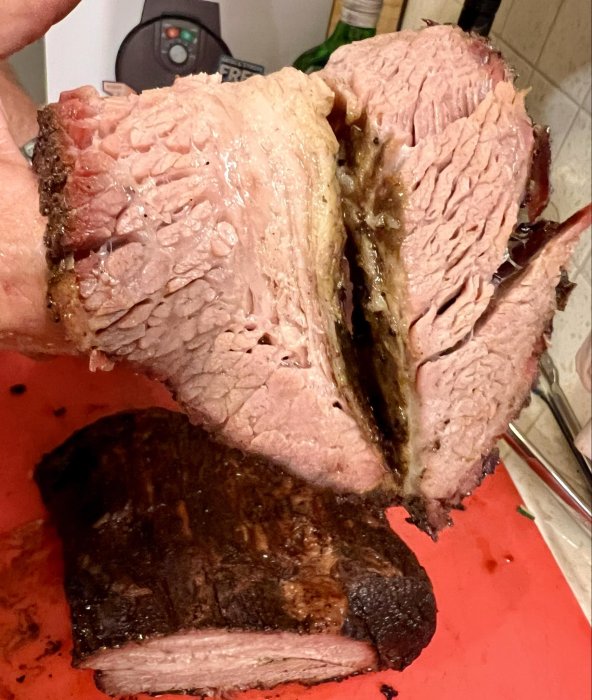 That is a long smoke.So I did a prime brisket starting on Sunday and finishing on Monday. I put it on the smoker at 4pm on Sunday at 225° along with a pan with the trimmed fat, injected some of the rendered fat and wrapped it Monday morning when it reached 165°, then took it off at 3pm Monday when it had reached a hair over 190° and put in a cooler with a bunch of rags for 2 hours. Very long smoke but MAN is it good. Even the flat was nice and juicy.