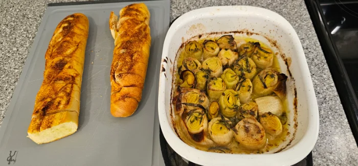 Recipe NOW!Here's a pic of the braised leek with a wine, cream, and anchovies sauce that I made for the game yesterday. Dip a slice of this crusty bread down in with a big gob of this... WOW. French onion dip wishes it tasted this amazing.
