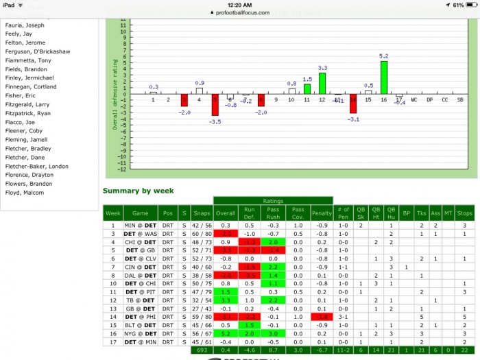 Secondly, for someone who cites PFF frequently, you seem to have overlooked their data on Fairley. The following is their data from '12, '13, '14. Maybe his off field issues were bad, but his on field production was much better than average. And before we allude to extra attention to Suh, nobody playing next to Watt, Quinn, or Atkins matched Fairley's stats.