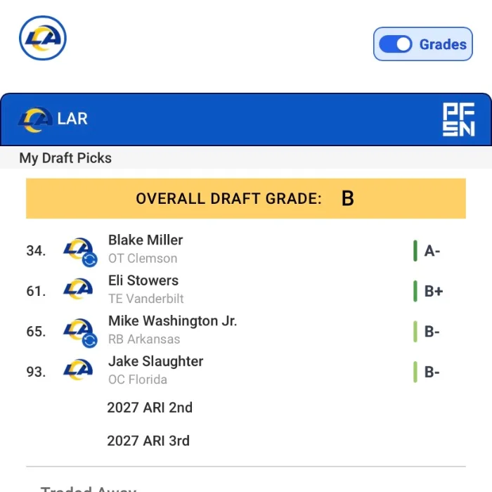 Here's another "draft of the day", using "The Athletic" database. Not bad, got some good trades, and if we walked away with this haul I'd be a happy fan. A solid WR2, a WR3 to replace Tutu & return kicks, a big ol Center (yes pls), and Golday to shore up the LB corps. Toriano Pride and his 4.32 speed will be welcome. Fagnano has size, smarts & promise as a QB2.