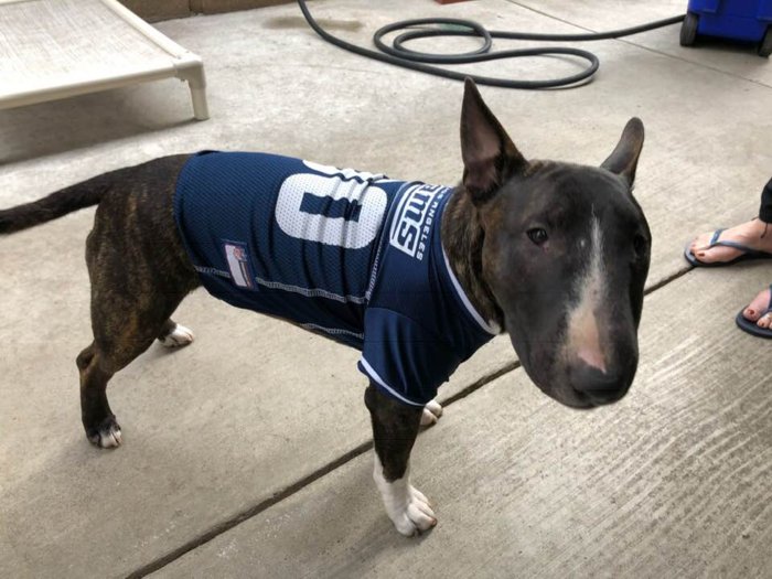 we have a mini bull terrier Luna and a rescue full size Jett. they are our 5th and 6th of the breed. Our last one Myla passed a little over a year ago. here she isTo all who have lost their Fur Babies... till the Rainbow Bridge.