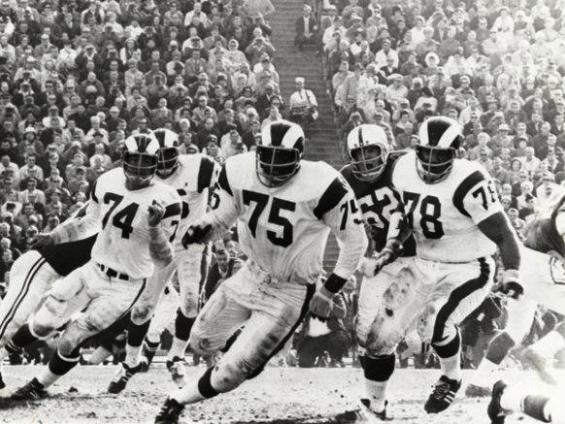 One of those is also a key moment in football history, period. That came in 1948, after the Rams' second season of their first stint in L.A. Halfback Fred Gehrke, who had studied art at the University of Utah, convinced coach Bob Snyder and owner Dan Reeves to let him paint ram horns on the team's headgear -- the first graphic ever to appear on an NFL helmet (further info here):