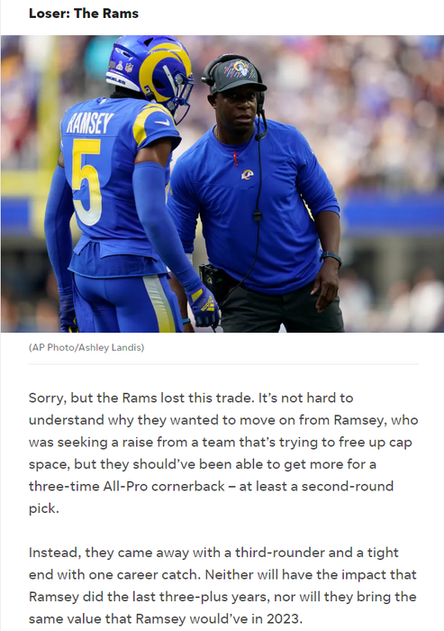 I agree what they got in return will not give them the same impact this year. But I'm pretty sure they don't expect to be a competitive playoff team this year. Ramsey was not gonna make them a playoff team. Who knows what impact Ramsey would be next year? And what it would do to their cap plans to compete. It was one of the hard decisions teams have to make. I believe it was the right one for the long term.