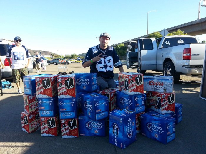 Wow that's a lot of water you have there.SoCal has a ton of Cowboys fans. There's a huge fan club there. I know the president (met them in SF), and we went to the game in SD, and our tailgate was about 100 people. We bought 30, 30-packs of beer in Compton before we left.
