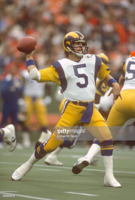 They won with defense Dickerson (once he ended his holdout) and great special teams.I guess he was better than I remember: "Brock signed with the Los Angeles Rams as a 34-year-old rookie, setting the NFL record for oldest rookie quarterback in history. Despite the team's star running back Eric Dickerson holding out the first two games over a contract dispute, Brock led the team to a 7-0 start, a feat no other quarterback would accomplish in their first season with a team again until Ben Roethlisberger started 13-0 with the Steelers in 2004.[4] Brock led the team to a division title, the #2 seed in the NFC playoffs, and set team rookie records for passing yards (2,658), touchdown passes (16), and passer rating (81.8) (most of his rookie passing records have since been broken). Brock's final game was the 1985 NFC Championship Game against the Chicago Bears, where he only managed 66 yards passing and lost a fumble that Wilber Marshall returned for a touchdown to close out the scoring in a 24-0 game."