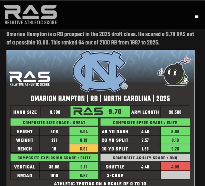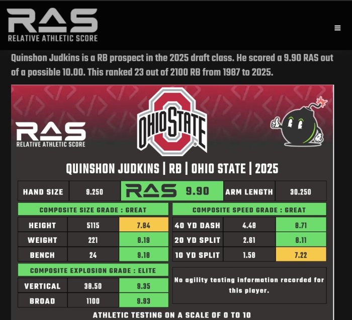 Here's the RAS scores for each running back I wouldn't mind with #26 not named Jeanty since he'll be long gone well before we pick. I still prefer Judkins personally.