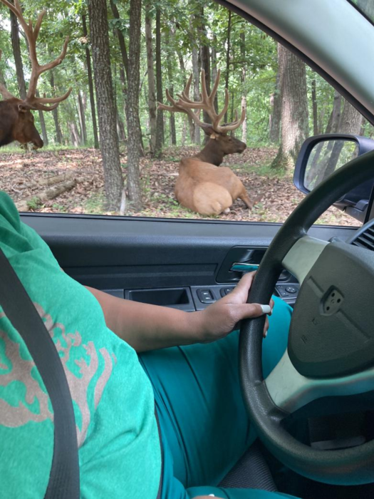Two absolutely massive elk at a national park in Missouri (Lone Elk Park, for any familiar with the area). I was lucky to catch them in this picture; as you can see, they camouflage almost perfectly with their coats, and I didn't see them until I was up there.