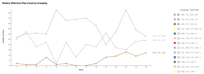 NFL.com, citing Next Gen stats, said Rams used 3-TEs for 30 and 35 plays in weeks 9 and 10. This does not seem to be reflected on the graph above. NFL.com is probably a semi-trustworthy source for NFL stats (imo).