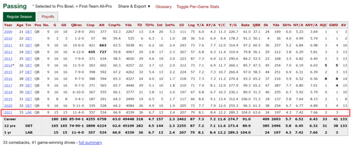 Goff 2021 (13 games): Comp% 67%, 17 TDs, 8 INTs, Sck 34