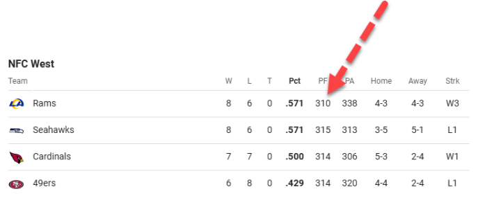 What's weird is all 4 teams are within 5 Points scored of each other. All averaging 22 PPG.What's interesting is we have more points against us than points scored, but are still in first place!