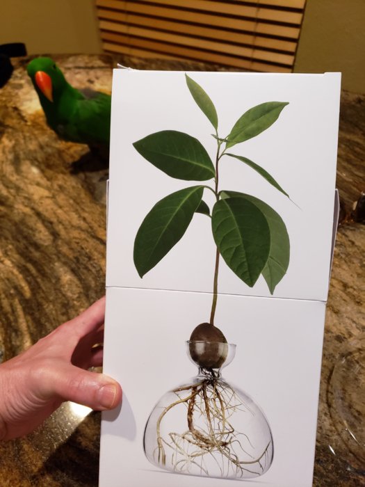 My parrot was checking out the box. LOL. I was actually telling him that the damn thing was going to grow a poison plant. Avocados are poisonous to parrots. He actually looks concerned here.