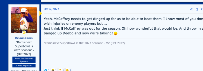 I wouldn't be mad because that was a penaltyI would likely be mad if that was called on a Rams player. Can't blame them for the same on their guy, though I'd want it called for us playing them.