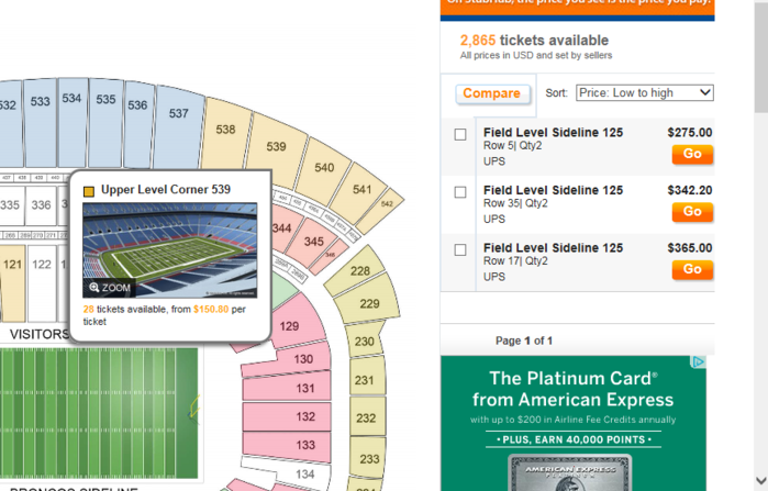 last years playoffs. 300-600 for first level is about right during reg season. Depends on the game 2, like Pats vs Den, is always huge compared to SDNot sure what people are telling you but this is for the Chargers game.Row 5 section 125 on Stubhub