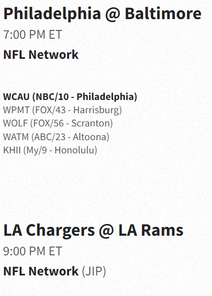 That is apparently dependent on your location because schedule says I'm getting Eagles vs Ravens as my evening live game unless some how that game is only going to last 2 hours. Not sure why they schedule the games two hours apart.